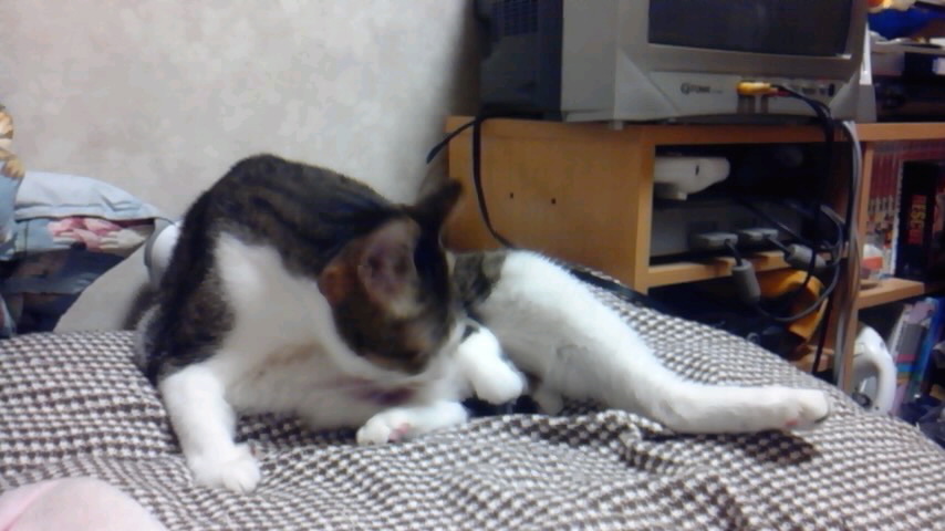 写真には ニャース、バロン アンジェリカ、カイ 次女の足が 写っていますが、、